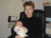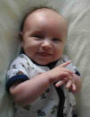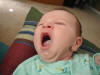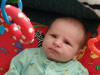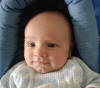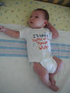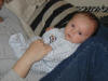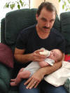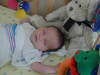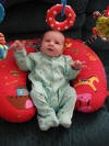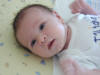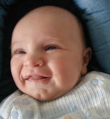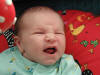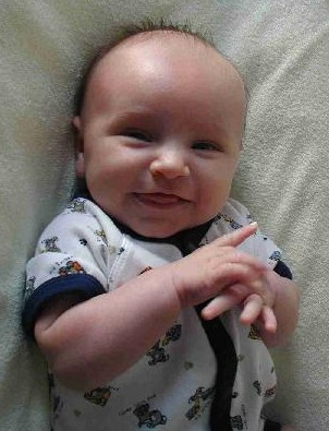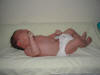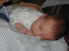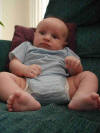 Around 5 weeks. One of the first smiles we captured, and a nudie (and he's not very happy about it). Notice that he's still got his umbilical cord stump... They say parents have no shame. Gee, does Dad look a little tired?